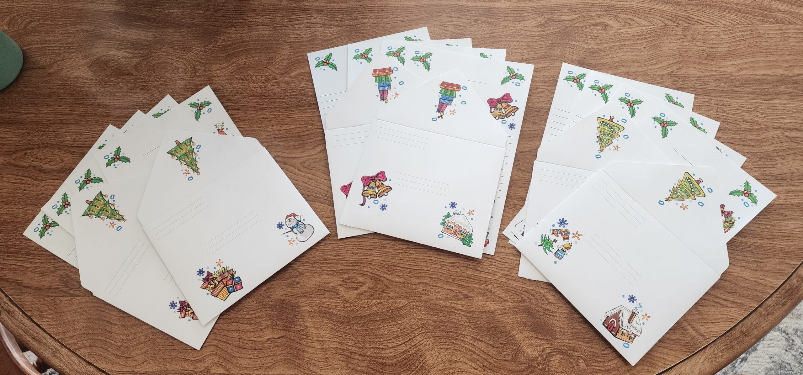 This order has 18 total “items”. 4 pages of each design, three designs, for a total of 12 pages. 2 envelopes of each design, three designs total, for a total of 6 envelopes.