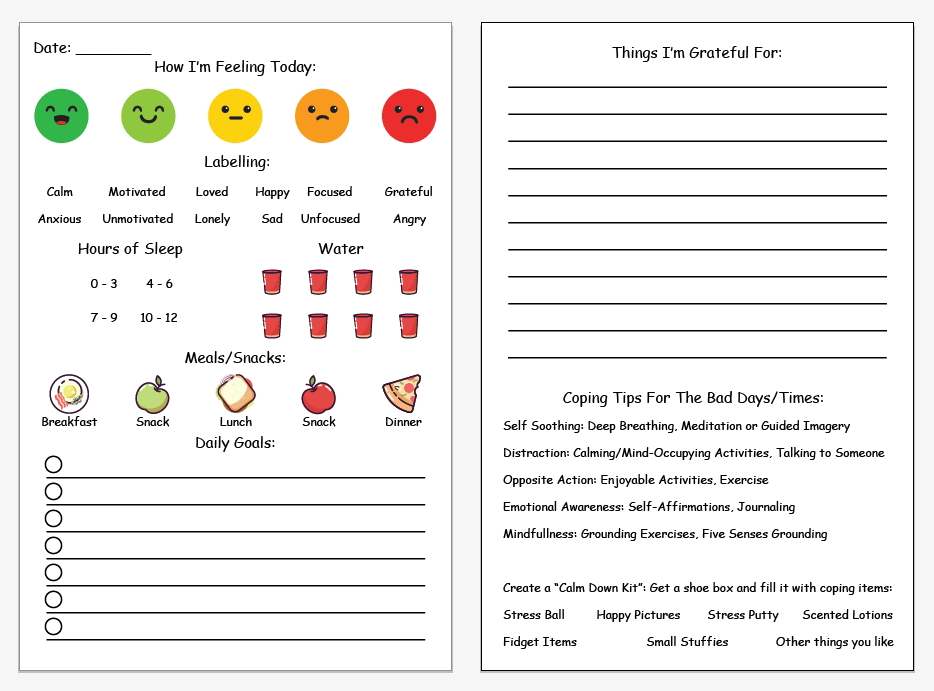 These cute 4×6 sized cards are printed on stationary type paper and can help you keep track of your daily mental health and make it easy to look back on the week and see how you were. They include a section for giving a quick notation of how you felt on a particular day and what kind of mood you were in. You can also keep a snapshot of how long you slept, how much water you drank, and if you had all your meals for the day. There is also a section for keeping track of a few daily goals and on the back, there is a place for you to fill up with affirmations, or just things you’re grateful for in general, as well as some tips and tricks to help you cope with the bad days/times.